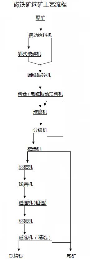 原矿经过两次鄂式破碎破碎后进入料仓中,料仓下方设电磁振动给料机,电磁振动给料机均匀将矿物给入球磨机中,磨矿产品经分级机分级,粗砂返回磨矿流程,细砂进入一段磁选,磁选尾矿抛弃,精矿进入二段磨矿,第二段磨矿为细磨,磨矿产品直接进入磁选机进行二段磁选,二段磁选为一磁粗选,一次精选流程,对一般类型的磁铁矿已可达到理想精矿品位,如遇特殊情况需另外考虑。