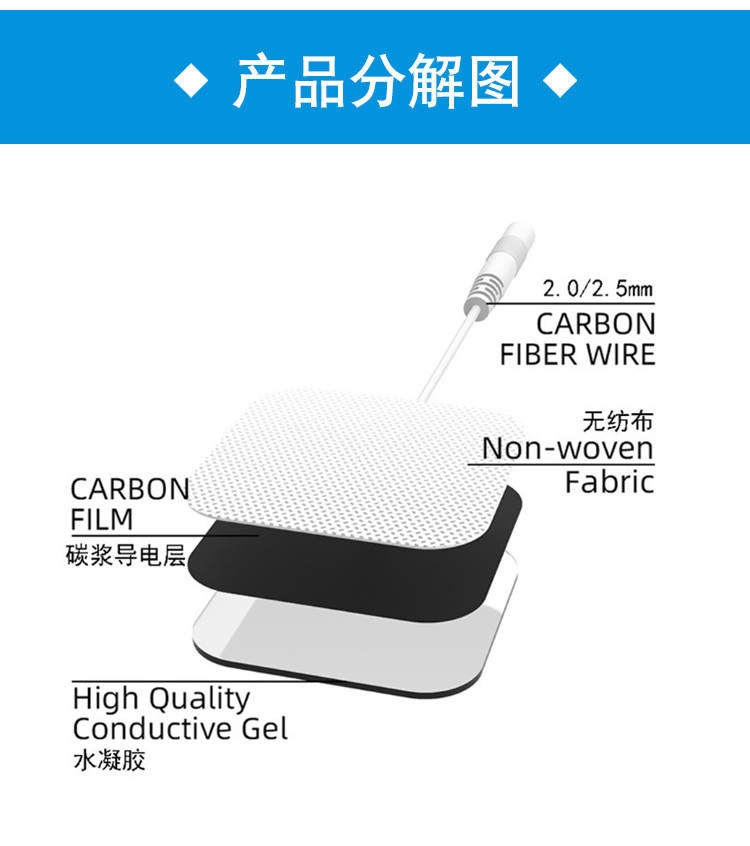 电极片简介-理疗电极片采用对人体无毒无害的凝胶材料或无纺布材料制成。电极片具有一定的柔韧性,可以较服贴地和人体皮肤接触;为了保证电流通路,电极片有一面是导电层。治疗时,必须将电极片导电层朝向皮肤,使治疗仪的输出电流顺利到达皮肤,才能达到治疗作用。