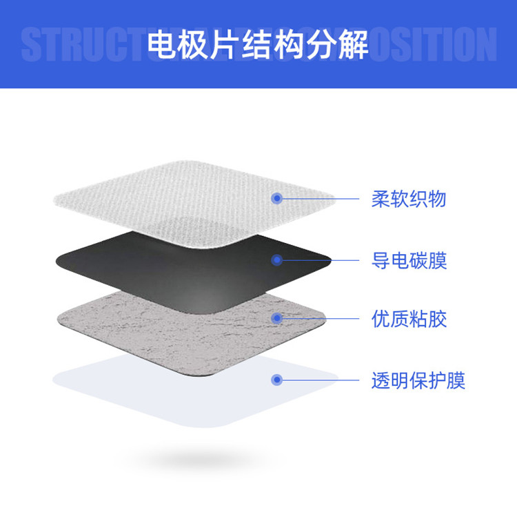 4. 电极片一般使用寿命为10—20次。(产品的使用寿命与皮肤特性和使用方法有关)