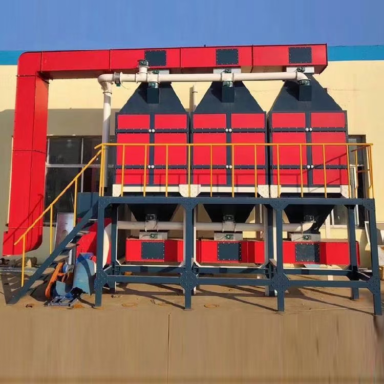 工厂车间从事生产作业时会产生刺激性等气体之污染物,对大自然生态与厂区环境都会造成空气污染之危害,该设备将所排放的废气加以收集后,利用活性炭吸附塔将废气处理至符合空气污染物排放标准后再排放至大气中,以免造成环境与人员之危害。
