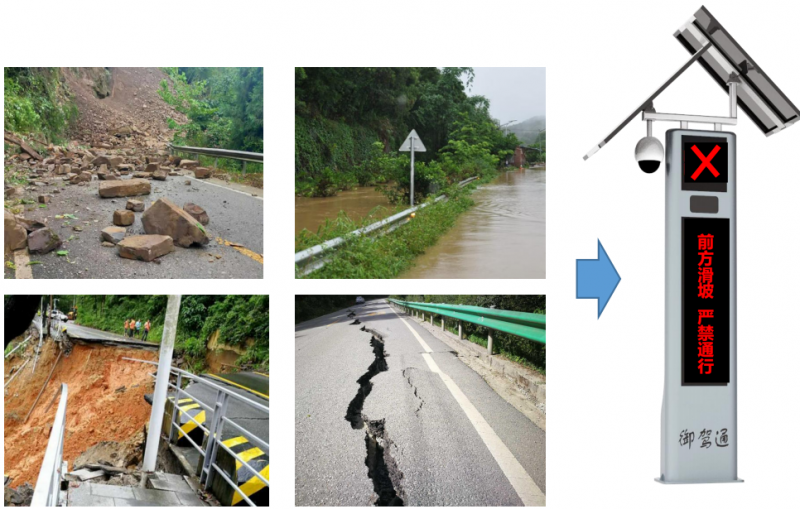 通过现场监控发现 道路一旁出现山体滑坡、 山体落石等情况,联动 预警系统提示来往车辆 前方危险谨慎驾驶