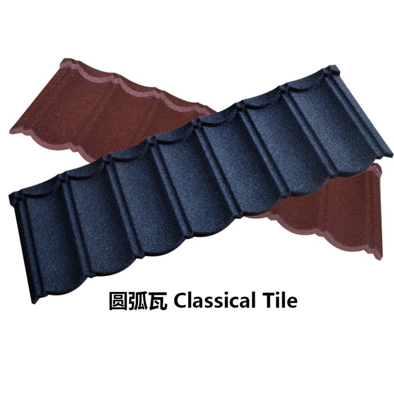 圆弧瓦,又名七波型经典型彩石金属瓦(Colorful Stone Coated metal Roof Tile)是由天然彩色石粒UV镀膜后,粘合在镀铝锌的钢板上制作而成的一种金属瓦。金湖彩石金属瓦以镀铝锌钢板为主原料,外表经加工被敷九层特殊物质制成,色彩美丽而且经久不坏。镀铝锌钢板是以铝(55%)、锌(43.4%)、硅(1.6%)制成,结合铝的耐腐蚀性和锌的防生锈效果而制成,经过特殊加工的金属瓦,不会因空气的氧化作用生锈,坚固的品质加以优雅的色彩。因此能很好的吸收雨水的热异常。其具有橄榄绿、金黄色、海棠红、海洋蓝、沙漠金、乌碳黑、中国红等十多种不同颜色。