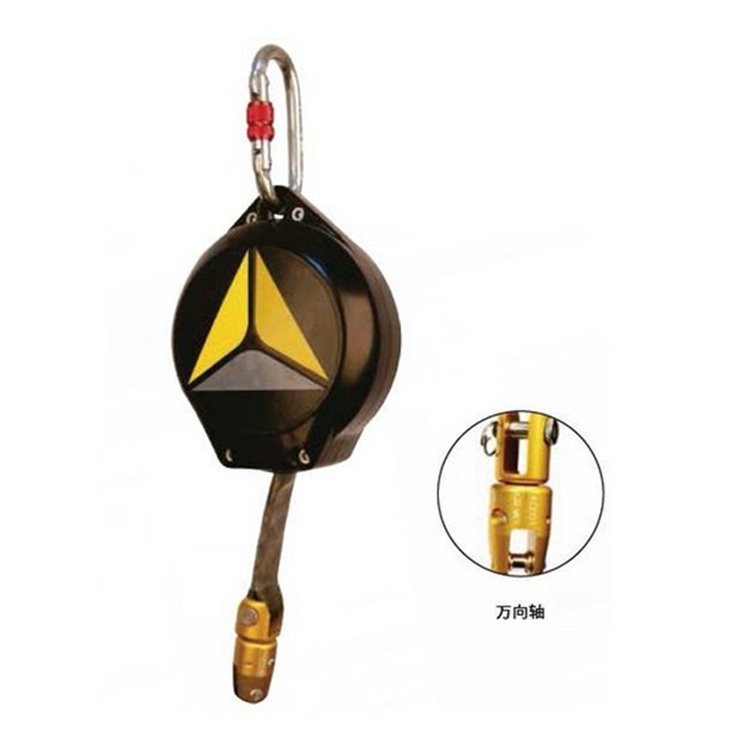 收缩式速差防坠器,底部配有万向轴,配有钢制O型钩AM002,高强度ABS防护外盒,缓冲带宽25毫米,展开长度 6米;
