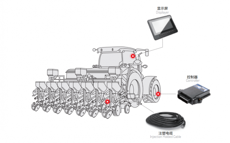 播种控制器装载在播种机上,负责计算行进车速、播种负压压力控制、播种种子数量采集、播种距离控制等。整个系统结构分布式布置,性能优异。
