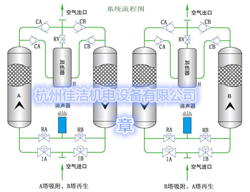 微热吸附式干燥机由装满吸附剂(活性氧化铝或分子筛)的两个双联机筒组成;压缩空气定时在两个机筒中轮流进行吸附和运行,从而使压缩空气能持续接触到干燥的吸附剂。一小部分气流通过减压阀进入机筒;使已吸附水份的吸附剂干燥,并将水份和杂质排放到大气中。