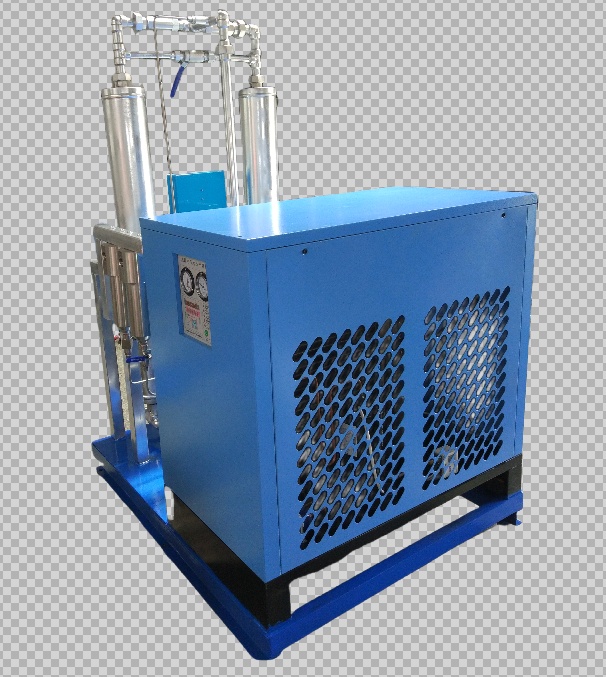冷冻式干燥机是根据冷冻除湿原理,利y全f闭压缩式制冷系统,对经空压机排出的压缩气体冷却降温,使其中所含的大量饱和水蒸气、油雾凝结液滴,经过经气水分离后由自动排水器排出。较高温度的饱和压缩气体进入冷干机的预冷器,在预冷器中与来自蒸发器的干冷气体进行热交换,降低温度后进入制冷系统的蒸发器,与冷媒蒸汽进行d二次热交换,使本身温度降到接近于冷媒的蒸发温度,在两次降温过程中,压缩气体中的水蒸汽得以凝结成液态水滴并随气流进入气水分离器,分离下来的液态水经自动排水器排出机外,温度较低的干燥压缩气体进入预冷器,与刚进入的湿饱和气体进行热交换,使本身温度得到提高,从而在冷干机排气口得到含水量较低(即l点较低)、相对湿度也很低的干燥压缩气体。冷冻式干燥机由于工作可靠、管理方便、运行f用低l而成为各行业空压站房净化设备的s选机型。