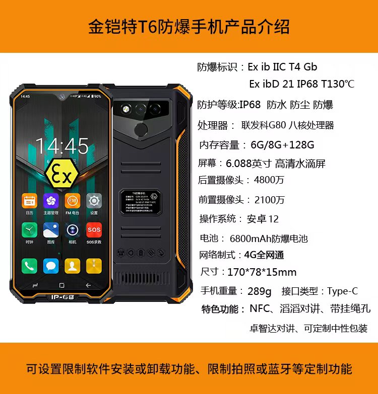 防爆标识:Ex ib ⅡC T4 GbEx ibD 21 IP68 T130°C防护等级:IP68 防水 防尘 防爆处理器:联发科G80 八核处理器内存容量:6G/8G+128G屏幕:6.088英寸高清水滴屏后置摄像头:4800万