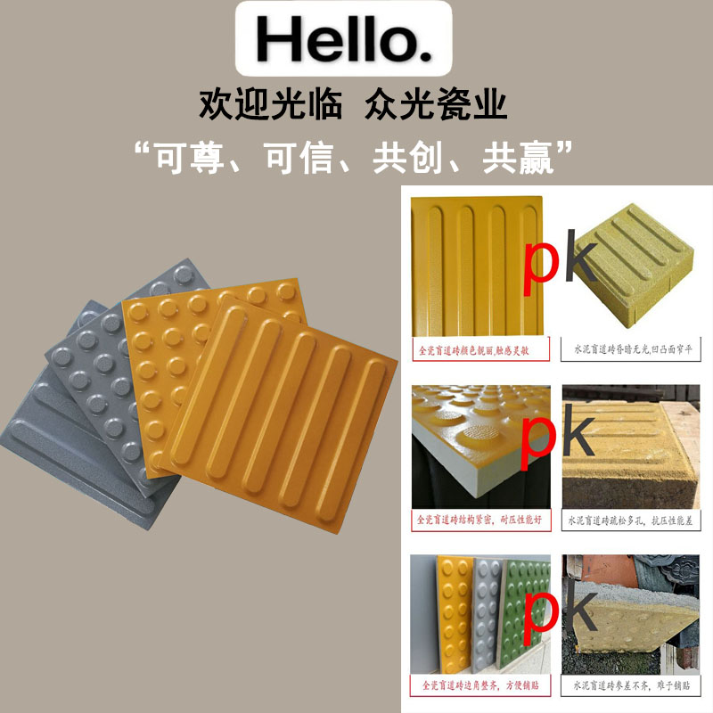 盲道铺装完成投入使用后也是需要不定时进行续维护保养,而易于保养与维护的盲道地砖在这更偏向于——全瓷盲道砖。该种盲道砖材质属陶瓷材质产品,瓷化度高用手敲击的话可以听到清脆声响,且平整度和边脚的翘脚度都比其它材质产品要好很多,瓷质产品的圆点和棱条的高度都是一致的。重要的是该种产品的盲道砖密度较高可达2.3g/cm3。