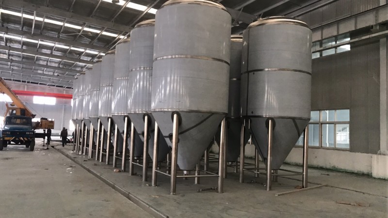 啤酒厂设备啤酒发酵罐,大型啤酒厂一般采用室外露天发酵罐配置,发酵罐顶部配备罐顶平台,发酵罐罐顶会配有罐顶装置;啤酒发酵是采用的酵母菌种,将采用酵母扩培系统以及酵母添加系统进行自动化处理;啤酒添加辅料时,还会配有啤酒稳定剂添加罐等配置组成