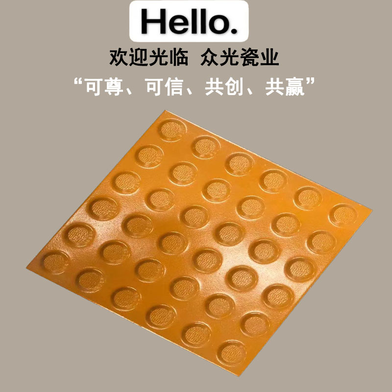 全瓷盲道砖通过质朴而深沉的黄色,自然演绎一幕幕“峥嵘岁月”,仿佛岁月叠连的年轮、斑驳晕染的旧信纸;抽象纹理,采用独特的配方,该产品从外观、实用等方面取代了石材、水泥、金属、塑胶等盲道材料,其色泽纯正醒目、美观大方。全瓷材质的额盲道砖有质朴无华的设计,洋溢着浓郁的风,让人感受到盲道有温度的设计,取材自然,匠心制造,打造让人惬意的舒适安全的盲道砖。