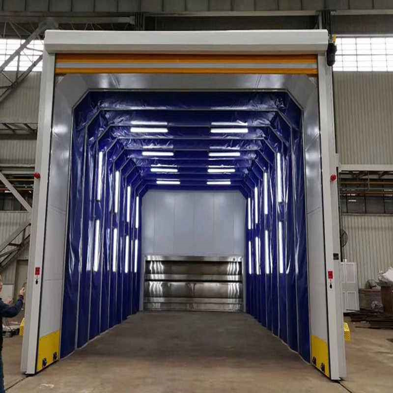 伸缩式喷漆房伸缩移动前室整体为钢制框架结构,可前后伸缩移动。框架之间的滑动连接机构保证框架在驱动装置的带动下沿地面的轨道前后竖直平行移动,同时带动蓬布展开合拢。移动前室收缩合拢时,将工件移入工作区,展开时可进行工件的喷漆或打磨工作。在不喷漆的工作时间内,可将前室合拢,腾出空间场地作为其他与喷漆交叉作业的工序使用。该设备可根据客户要求,漆雾处理设备可为湿式(无泵水幕、水帘)或干式(过滤棉、折流板) ,有机废气经过喷雾处理后再进入废气处理装置净化处理后高空排风,经过过滤的废气达到环保标准。
