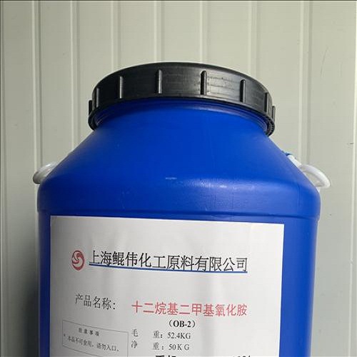 OB-2调理剂 化学组成:十二烷基二甲基氧化胺 十二烷基二甲基氧化胺(OB-2调理剂)技术指标: 项目 指标 外观 透明粘稠状液体 活性物含量,% 30±2.0 游离胺含量,% ≤2.0 色度,Hazen ≤100 PH值(10%水溶液) 6.0-8.0 过氧化物含量,% ≤0.2 十二烷基二甲基氧化胺(OB-2调理剂)性状与用途: 无色透明液体,为弱阳离子表面活性剂。本品洗涤性能优良,泡沫丰富而稳定,性质温和刺激性低,具有优良的抗静电性和柔软性。主要用于餐具洗涤剂,洗发香波、洗浴剂及液体洗涤剂配方等作为增泡稳泡剂,能改善增稠剂的相容性和产品的整体稳定性。 包装贮存: 净含量50公斤/塑桶。应密封贮存在室内;在运输过程中,应小心轻放、防撞、防冻、以免损漏。