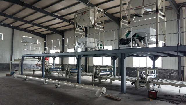 2、)匀质板成套设备采用PLC自动化控制,实现了原料自动入仓、自动输送、自动计量、自动搅拌、伺服式自动上模板、自动涂油、自动铺布、自动喂料、自动摊平、在线自动切断、自动增速复压、自动码垛、自动进入养护室、自动卸垛、自动脱模、自动分切、自动吸尘、产品自动码垛、自动包装、自动清洗模板、模板自动码垛、自动进入待用区等功能。