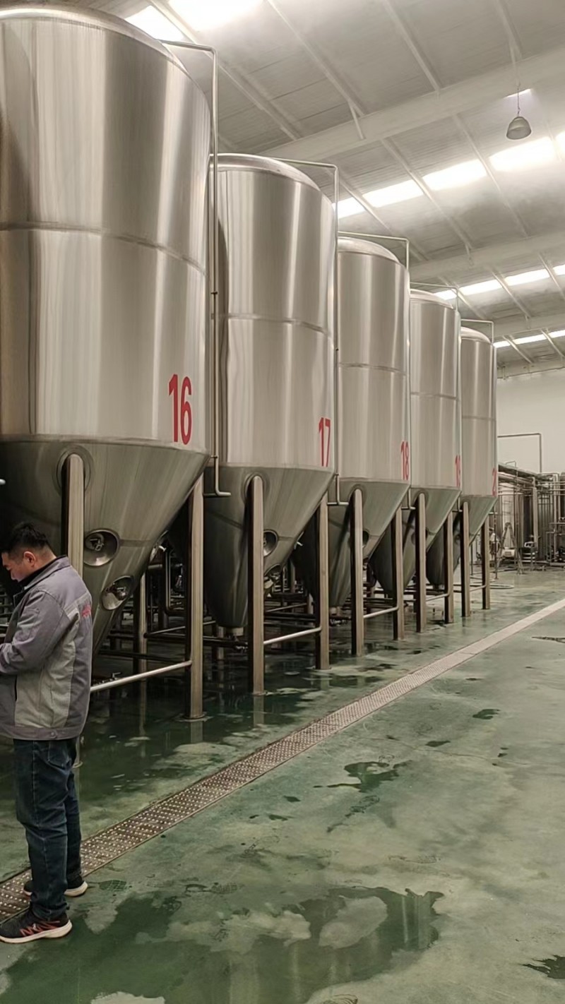 啤酒厂设备啤酒发酵罐,大型啤酒厂一般采用室外露天发酵罐配置,发酵罐顶部配备罐顶平台,发酵罐罐顶会配有罐顶装置;啤酒发酵是采用的酵母菌种,将采用酵母扩培系统以及酵母添加系统进行自动化处理;啤酒添加辅料时,还会配有啤酒稳定剂添加罐等配置组成