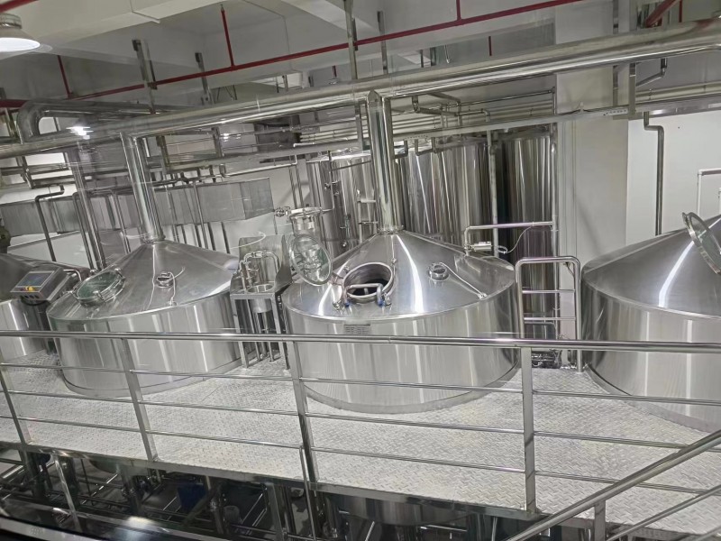 啤酒厂设备啤酒发酵罐,大型啤酒厂一般采用室外露天发酵罐配置,发酵罐顶部配备罐顶平台,发酵罐罐顶会配有罐顶装置;啤酒发酵是采用的酵母菌种,将采用酵母扩培系统以及酵母添加系统进行自动化处理;啤酒添加辅料时,还会