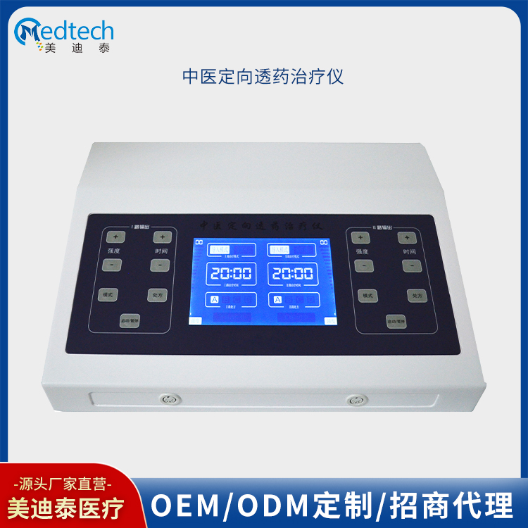 中医定向透药治疗仪:通过独创的非对称中频电流产生的脉冲,对药物离子产生定向的推动力,使药物中的有效成分更深入、更有效地透过皮肤粘膜快速的进入人体,靶向作用患部病灶。同时具备模拟中医针灸、按摩,拔罐,推拿,刮痧,锤击、揉捏等多种手法,有利促进透化经皮吸收,具有促进血液循环,中医定向透药疗法融合了中医治疗,药物治疗,物理治疗等相关技术,中西医结合,达到更好更快的治疗效果。