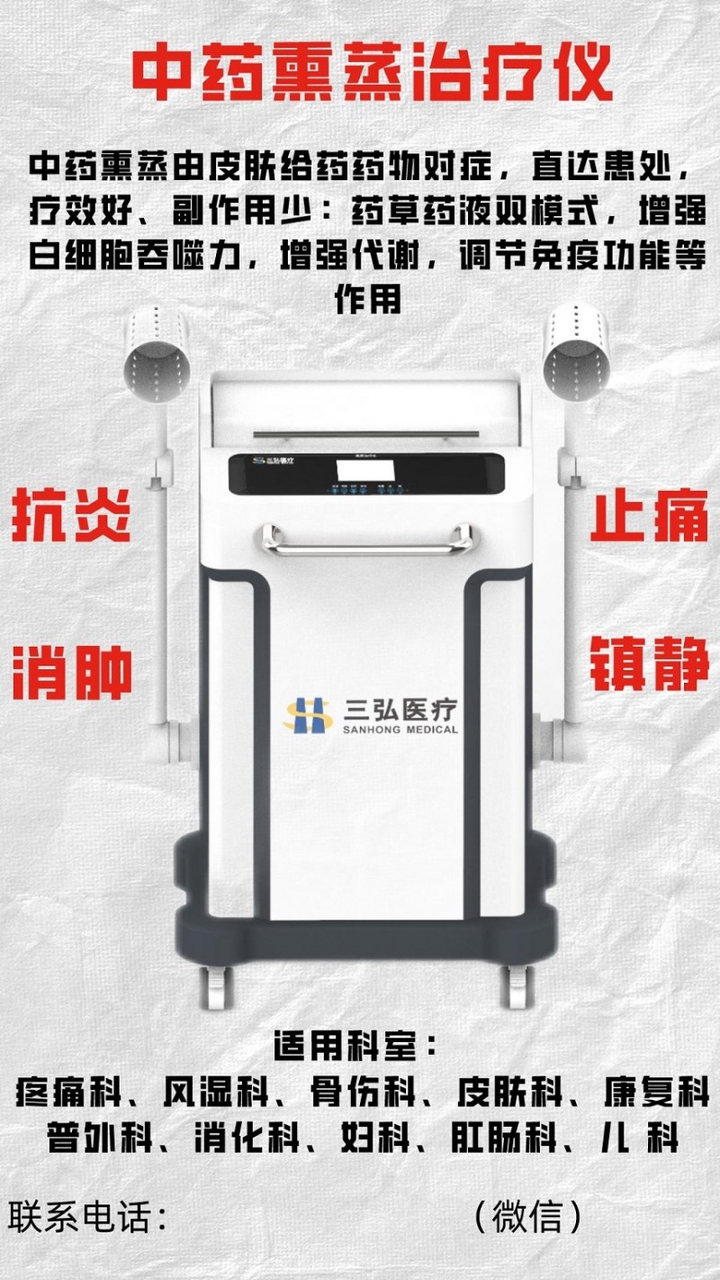 适用在疼痛科、骨伤科、康复科、普外科、儿科、妇科、风湿科、皮肤科、消化科、肛肠科等局部熏蒸理疗,通过扩张局部血管、促进、温通血脉,具有祛毒、止痒、清洁伤口、消肿止痛等,对、风湿寒性关节等效果显著。