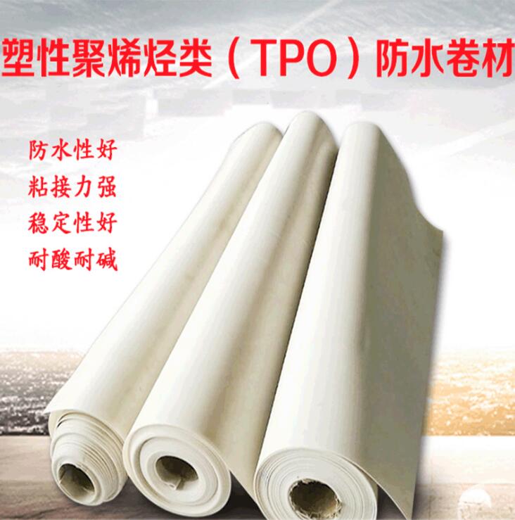 TPO防水卷材,是一种以采用先进聚合技术将乙丙(EP)橡胶与聚丙结合在一起的热塑性聚烯烃(TPO)材料为基料,以聚之前为网络织物做胎体增强材料构成,并采用先进加工工艺制成的片状可卷曲的防水材料。