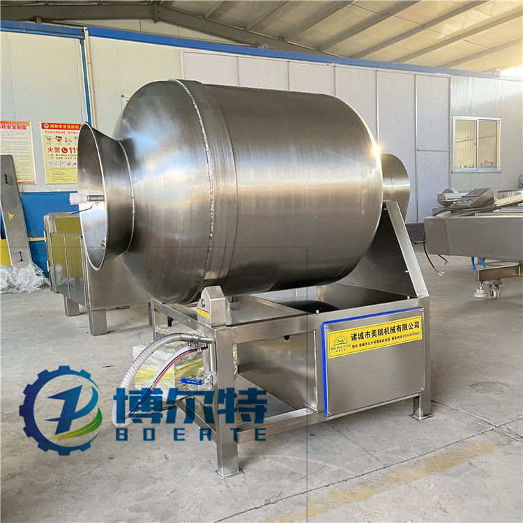 全自动肉类真空滚揉机 大型真空滚揉机通过筒体转动进行可提调味品进入肉品的速度,是将块状肉在真空状态下,并限度的保持肉内的水分。使用真空泵抽真空并保持真空度。也叫真空腌制机,将吸料管连接上吸料。主要是将加工的肉类,在达到一定的负压的时候,如牛肉,羊肉,鸡肉,鸭肉,鹅肉,猪肉,鱼肉,蛋及蔬菜,加料:开启真空泵,果品放在真空状态内,