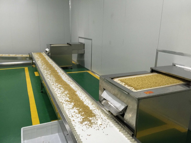 黄豆微波烘烤设备,黄豆脱腥设备 五谷杂粮微波烘焙设备是将被加热物料本身作为发热体,微波的焙烤作用可以瞬时深入到物料内部,使物料内外同时受热,不需要热传导的过程,所以温升极快,大大缩短了加热时间,所需时间一般为常规方法的1/4左右。烘烤和其他食品加工一样,是复杂的物理化学体系,需要有序发生并有合适的时间/温度条件。微波快速加热会造成焙烤产品的断裂、过度膨。微波加热速度快,物料内部气体(空气)温度急剧上升,由于传质速度慢,受热气体处于高度受压状态,而有膨胀的趋势,达到一定的压强时,物料就会发生膨胀。 随着社会的发展,人身体制越来越差,然而人们研发出了各种五谷杂粮养生料包,供人们饮食食用。五谷杂粮烘焙一般是用传统的转炉进行烘焙熟化,我们现在研发出了新型微波五谷杂粮烘焙设备。微波五谷杂粮烘焙设备可以对五谷杂粮进行快速烘焙,加工出来的五谷杂粮色泽鲜艳,粒粒饱满。传统的五谷杂粮熟化方式是用烧煤或者燃气的转炉,这种传统方式烘焙出来的五谷杂粮,首先是色泽不鲜艳、烘焙不均匀,其次是温度比较高烘烤出来的五谷杂粮营养成分低。微波五谷杂粮烘焙设备烘焙出来的五谷杂粮比较均匀、色泽好看,而且烘焙时间比较短一般3-8分钟即可。