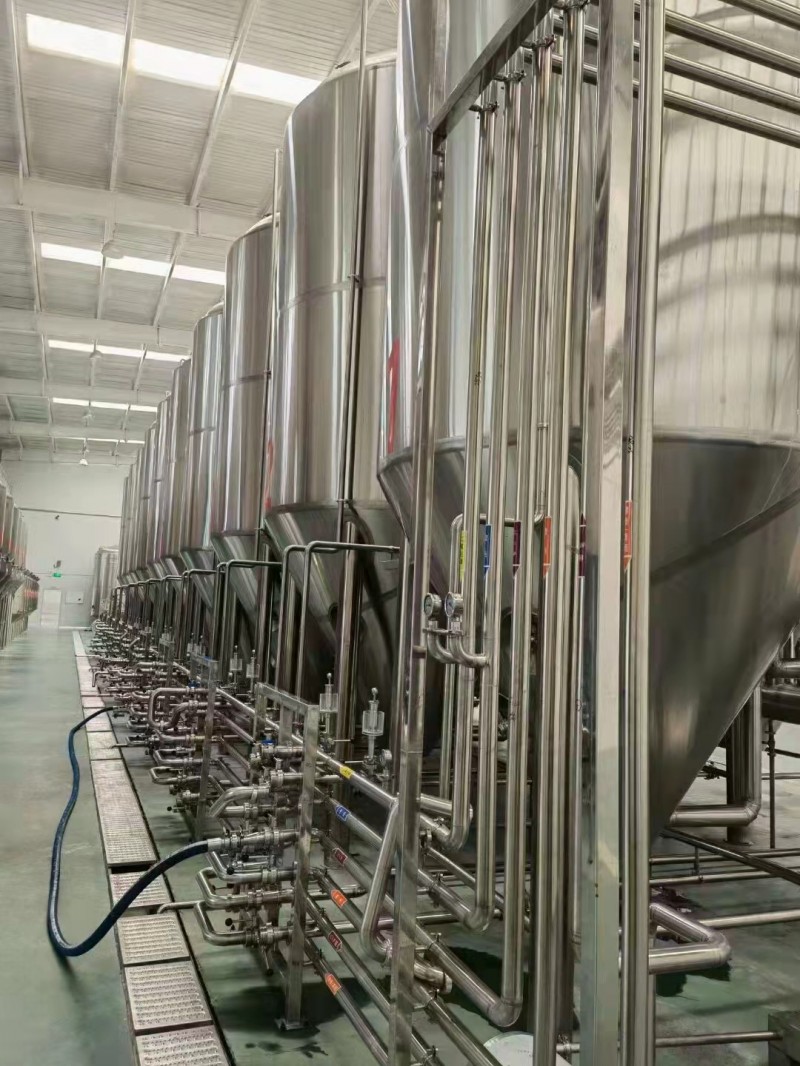 啤酒厂设备啤酒发酵罐,大型啤酒厂一般采用室外露天发酵罐配置,发酵罐顶部配备罐顶平台,发酵罐罐顶会配有罐顶装置;啤酒发酵是采用的酵母菌种,将采用酵母扩培系统以及酵母添加系统进行自动化处理;啤酒添加辅料时,还会配有啤酒稳定剂添加罐等配置组成