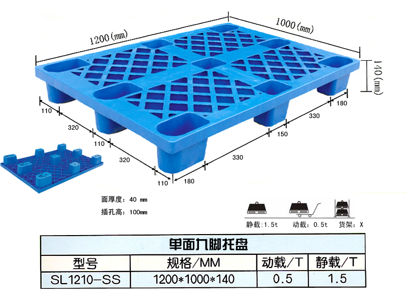 注:九脚网格托盘内部可加入钢管,是为了达到增加承载的目的,延长托盘的使用寿命,塑料托盘如要在低温环境中长期使用,要选择全新料生产的产品。
