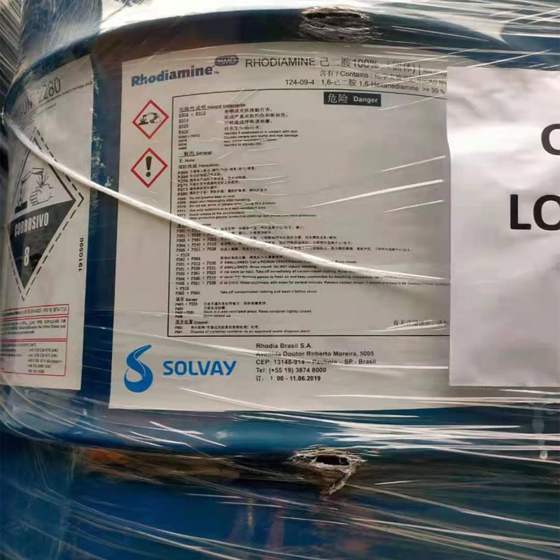 己二胺常温常态下为无色透明的结晶体,熔点41-42℃,有氨臭味,易潮解,含量99.5%以上,原厂包装,白色镀锌铁桶。属于8类腐蚀品。微溶于水,难溶于乙醇和苯。河南神马:160kg/桶,上海英威达:160kg/桶,索尔维:170kg/桶