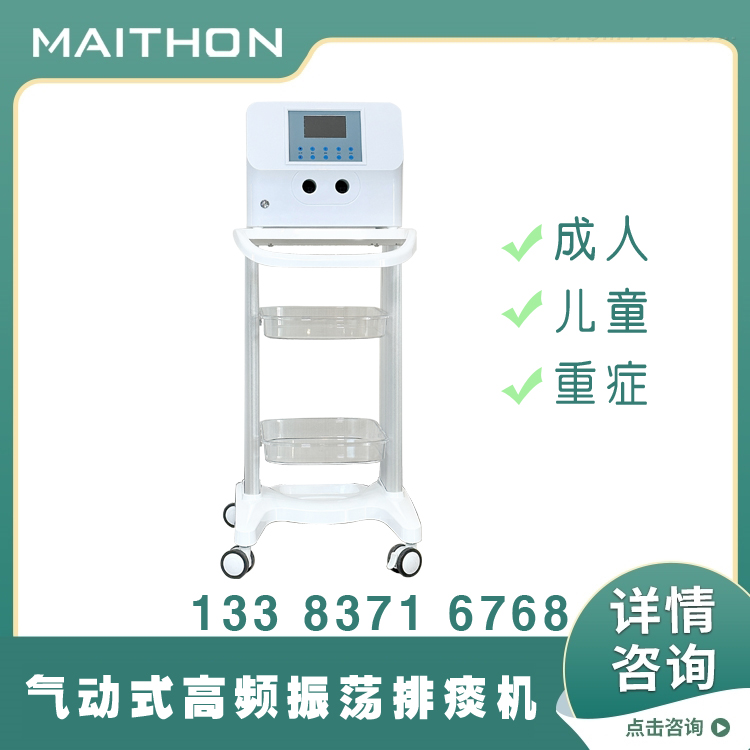 迈通振动排痰机可调节频率和时间,提供双重力,同时作用,能使痰栓在松动、液化的基础上自动向主支气管方向移动,通过咳嗽或吸痰等方法将肺内部支气管分泌物排出体外。