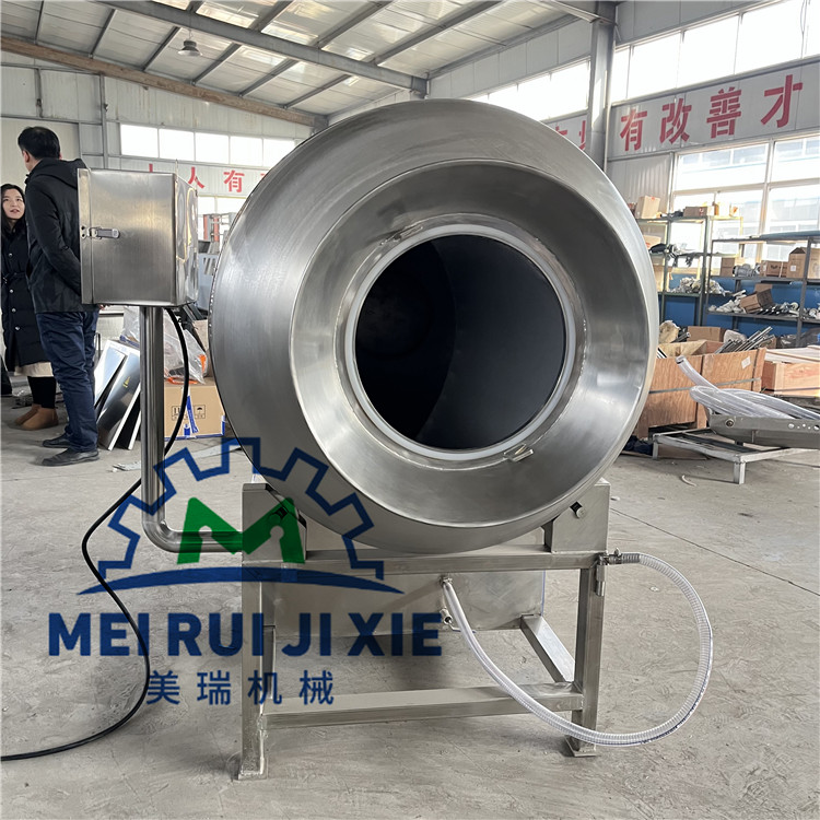 全自动真空滚揉机 不锈钢真空滚揉机 自动出料真空滚揉机滚揉总时间到后,滚筒将会自动停止,并保持筒内为真空状态并继续计时,直至设定的静置时间到,发出报警信号,提示操作人员可以开盖取出桶内的物料。此时按下消真空按钮就可消除真空,这时可卸掉筒盖,接着按下卸料按钮,滚筒即按出料运转方向(顺时针方向)旋转,从而将肉料自行送出,落入接在筒口下面的肉车等容器内,完成了整个工艺流程。