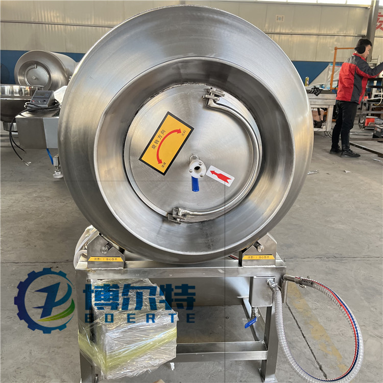食品真空滚揉机 多功能真空滚揉机整机采用不锈钢制造,结构紧凑,滚筒两端均采用旋压式封帽结构,的增加滚筒内的摔打空间,使滚揉产品的效果均匀,噪音小,性能可靠,操作简便,使用效率更高。 真空滚揉机也叫真空腌制机,主要是将加工的肉类,如牛肉,羊肉,鸡肉,鸭肉,鹅肉,猪肉,鱼肉,蛋及蔬菜,果品放在真空状态内,也提高调味品进入肉品的速度,并大限度的保持肉内的水分。