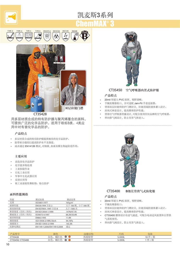雷克兰 CT3S428耐用型凯麦斯3防化服规格: