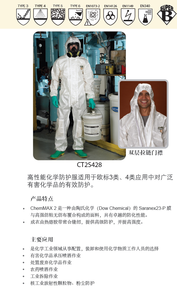 高性能的经济性化学防护服,适用于欧标3类、4类应用中对广泛有害化学品的有效防护