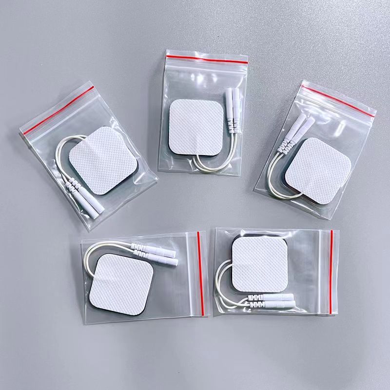 揭去离型膜,将理疗电极片贴于人体表面,将理疗电极片连接线与电疗设备连接即可。