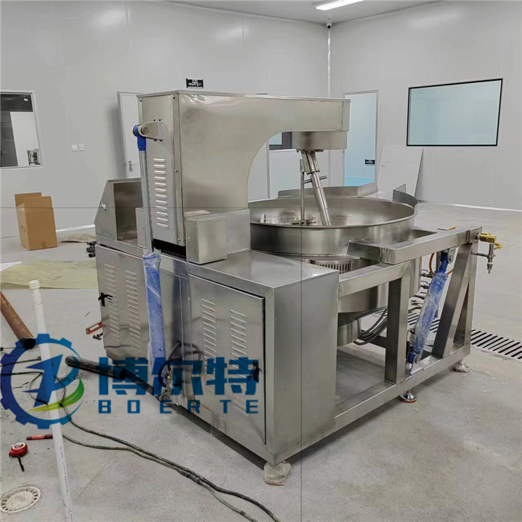 全自动大型燃气炒锅 辣椒酱炒锅特点:高粘度横轴卧式搅拌夹层锅本机的U形锅体顶部抽真空,夹套采用蒸汽加热,无段变速与蜗轮、减速机的组合传动,增大了横轴搅拌的力矩,采用聚四氟乙烯材质刮板的搅拌器,在物料的翻滚搅拌过程中,搅拌器与锅体的全方位充分接触,确保了无搅拌死角。锅体的开盖、卸料、复位采用液压、 机械传动控制,操作极为方便。真空炒制可降低炒制温度,特别适应于热敏感原料的炒制,避免了因过度受热引起颜色及口味的劣化,保持了原料原有的色、香、味。提高了炒制效率,并降低能耗,缩短了炒制时间。