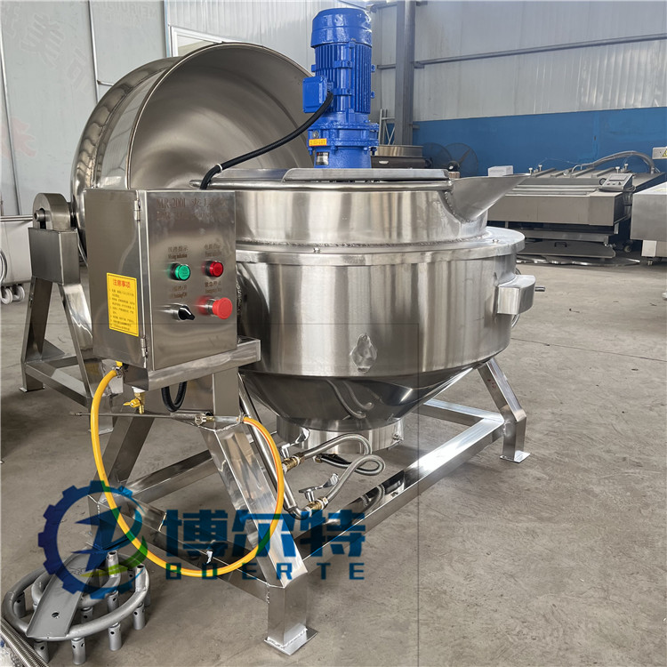 骨汤熬煮夹层锅 多功能炒锅 行星搅拌炒锅设备特点:设计理念是通过自动化设计与制造为企业节约人力,提高产量,降低生产成本。设备易于操作,工作效率高,耗能低,使用寿命长,结构紧凑,维修方便等特点。搅拌系统用的搅拌方式是采用特殊的倾斜转动,使行星是搅拌器与锅体充分接触,实现转动与自传的不整数转动比,使锅内无搅拌死角,物料搅拌混合更均匀,搅拌器采用聚四氟乙烯的刮板与锅体的贴合度高,刮底更彻底,不容易产生糊锅现象。