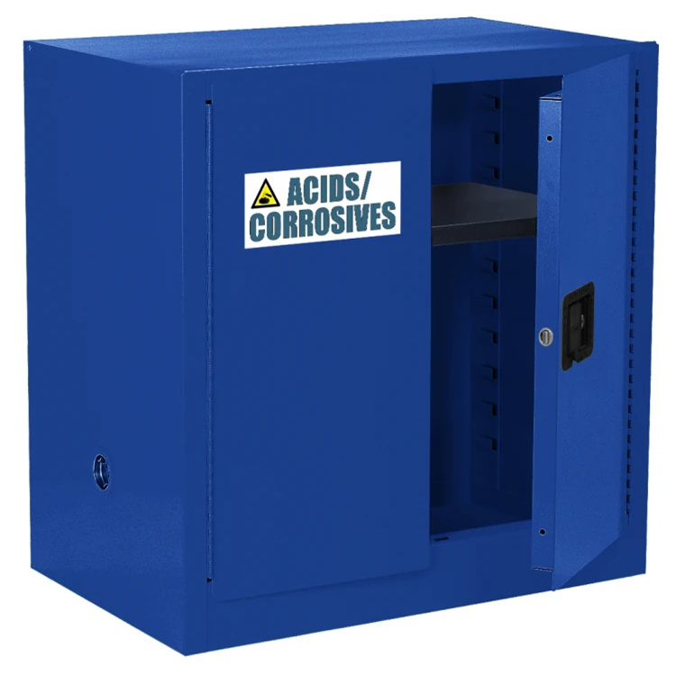 蓝色弱酸碱储藏柜,柜体采用优质冷轧钢板材料后选用,这些材料由于其自身的特点,具有一定的耐腐蚀性,适合制作这种耐腐蚀的储藏柜。当然,材料本身是不够的,所以钢板会采用180度高温固化成型,增加其硬度,酸洗磷化处理,以防锈处理,增加其使用寿命。此外,形成柜体后,在柜体内外喷涂无铅环氧漆,可大大提高柜体的整体耐腐蚀性,提高柜体的安全性。在结构上,柜体采用双层耐火钢板结构,在两层钢板夹层之间,这种夹层厚度可达38毫米,形成了坚固的保温层,能够有效地隔绝柜体外部环境对内部环境的影响,从而减少内部环境的波动,使柜体内部环境保持稳定的范围。此外,柜体左右两侧设有带有关火装置的通风口。通风口分布在左右两边。用户可通过调节通风口控制柜体内湿度和温度的变化,使柜体内环境保持在安全范围内。