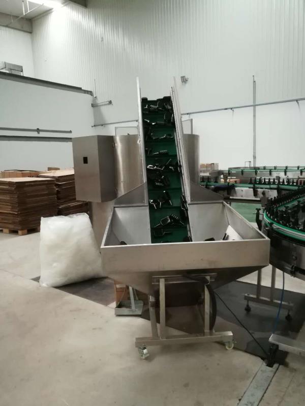 待整理的瓶子由储瓶仓或人工辅助装入提升机储瓶斗,经皮带提升至排瓶机筒内,由导瓶片带动轨道,在有翻瓶器播正,经由滑到进入风送轨道。