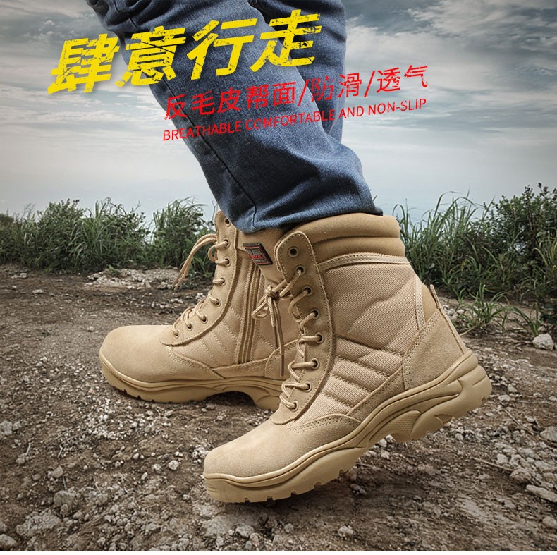 1.8mm-2.0mm 优质沙色牛反绒+1200D 高级尼龙布,沙色高帮透气作训靴;