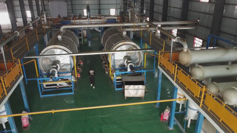 废轮胎炼油设备中的上料系统包括自动上料机,用于将废旧轮胎输送至热解反应釜。这一过程自动化程度高,能够有效减少人工劳动,提高生产效率;热解反应釜则是整个设备的核心部分,通常由耐高温材料制成,内部设有加热装置。通过在无氧或微氧环境下高温加热,轮胎中的有机成分被分解成气态产物;热解后经过冷凝系统,包括冷凝器和油气分离器,主要用于将高温裂解气体冷却并液化为燃油,同时去除油气中的杂质,确保燃油的品质;随后进入气体净化系统,包括除尘器和洗涤塔,用于去除裂解气体中的固体颗粒和酸性、碱性成分,确保排放气体符合环保标准;最后为炭黑处理系统,包括炭黑收集器和炭黑包装机,用于收集和包装裂解产生的炭黑,便于运输和销售;在废旧轮胎炼油设备中加入钢丝处理系统,包括磁选机,用于将裂解后残留的钢丝与其他物质分离,实现钢丝的回收利用;在整套设备中,PLC控制系统必不可少,用于实现整个生产过程的自动化控制和监测,提高生产效率和安全性。