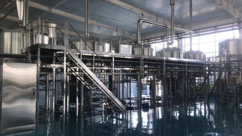 发酵系统说明:此阶段为啤酒酿造阶段。具体流程为:投料-糖化-过滤-煮沸(添加酒花)-回旋沉淀-麦汁热交换,然后泵入发酵罐进行发酵。啤酒发酵罐存储12-15天时间即可发酵储存成熟。