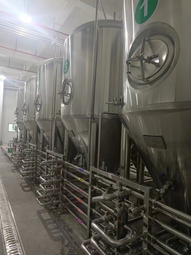 发酵系统说明:此阶段为啤酒酿造阶段。具体流程为:投料-糖化-过滤-煮沸(添加酒花)-回旋沉淀-麦汁热交换,然后泵入发酵罐进行发酵。啤酒发酵罐存储12-15天时间即可发酵储存成熟。
