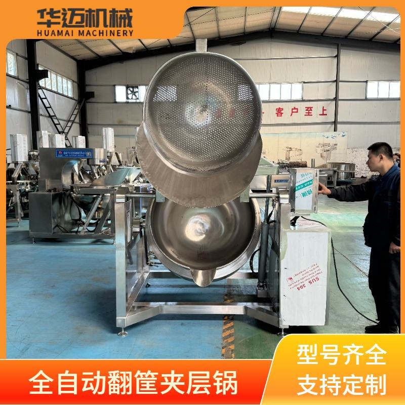 夹层锅分为带翻筐夹层锅,带搅拌夹层锅,和普通夹层锅,有电加热和燃气加热两种,今天我们这款是带翻筐夹层锅,通过短时间的内达到想要的温度,可以达到焯水飘荡的作用,也可以卤煮肉制品熟食,带搅拌还可以熬制酱料等,是熟食店和工厂卤煮熬制设备。