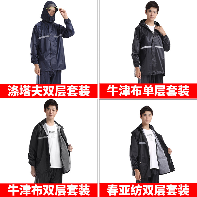 户外骑行:对于骑电动摩托车、自行车的人来说,分体设计不妨碍骑行操作,能全面覆盖身体防止雨水打湿,反光条可增加在雨天的辨识度,降低交通事故发生概率。