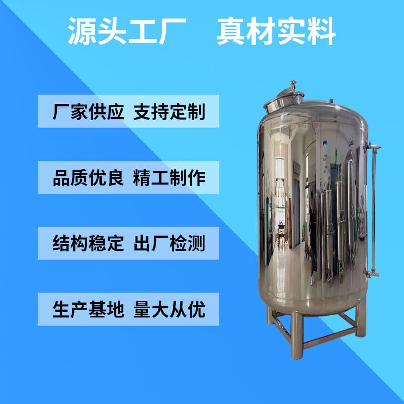 单层不锈钢罐体、常压人孔、进料口、出料口、四条腿支撑等。可根据用户需要进行合理设计和添加其他装置,可选配清洗喷淋及液位计装置。