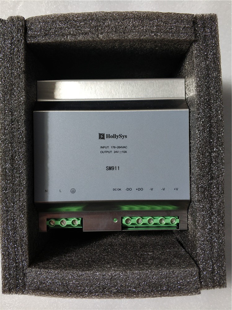 SM911 是SM 系列控制系统硬件产品中的24VDC 电源模块,实现220VAC 到24VDC 输出的转换,输入与输出隔离;SM911 具有输出短路保护功能,故障消除后电源自动恢复。SM911 带有电源故障状态输出端子,电源输出正常时,状态开关导通,否则截至,为远程诊断电源工作状态提供了接口;SM911 还带有输出状态指示功能,输出正常指示灯“DC OK”亮。