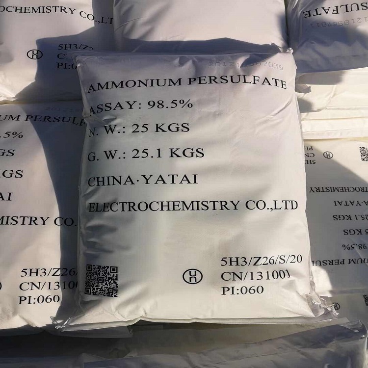 国标过硫酸铵 工业优等品 含量98.5%以上 25公斤/袋;济南仓库现货稳定40吨/月,一件起售零担整车均可供应;主营品牌有河北亚泰电化、陕西宝化、福建展化、河北冀衡、龙翔等;过硫酸铵也称过二硫酸铵,是一种铵盐,化学式为(NH4)2S2O8,分子量为228.201,CAS登录号7727-54-0,EINECS登录号231-786-5,熔 点120 ℃(分解),密 度1.98 g/cm3,外 观白色结晶性粉末;过硫酸铵被广泛地用于蓄电池工业。它还用作聚合的引发剂、纤维工业的脱浆剂,并可用作金属及半导体材料表面处理剂、印刷线路的刻蚀剂,还广泛用于石油开采的油层压裂,面粉和淀粉加工业、油脂工业, 在照相工业上用来除去海波。