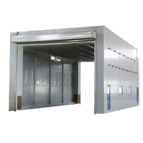 整体移动式喷漆间的设计目的,是为了满足较大型工件 打磨或喷漆的需要。一般情况下每套房体对应2~3个排风净化工位,哪个工位上的工件需要喷漆时,房体则行走移动到那个工位,其他工位可以继续打磨工作,待 房体内的工件喷漆完毕后,再控制移动房体行走到打磨完毕后的工件工位,如此设计可以实现大型工件的不间断连续喷漆工作。房体为钢结构构造,房体立柱下面设置有两台电动驱动行走机构,行走机构沿地面轨道行走。移动房体两端设置有电动卷帘大门,房体行走时,大门升起,待到达位置时,大门降落关闭。大门与行走机构由电气控制部分连锁控制,大门完全升起后,房体才可移动行走。