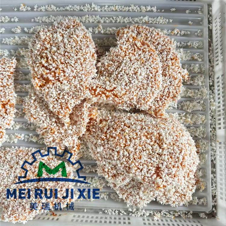 咔滋脆鸡排加工,先对鸡胸肉进行切片,然后腌制,之后上浆裹粉裹糠油炸速冻包装,咔滋脆鸡排需要用滚筒上粉机才能上粉均匀,而且会根据鸡排的纹理来进行上粉。