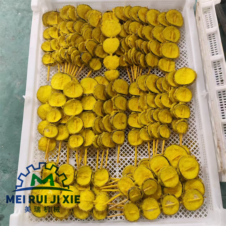 蔬菜串天妇罗产品上浆裹粉油炸生产线可运用各种粉料对产品的表面进行充分裹涂,可裹涂禽类、海鲜、肉类和蔬菜等产品,设备运行稳定、粉料更换快、清洗便捷。裹粉机使用的粉料必须干燥,使用前要检查确保机身内部无积水,如果内部潮湿粉料会黏连网带导致撒粉不均匀、影响裹粉效果,如果粉料结块严重还会造成网带拉长变形,在实际生产过程中必须要重视。