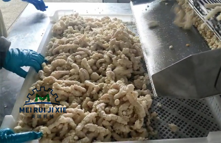 香酥鱼小黄鱼上浆裹粉油炸生产线可运用各种粉料对产品的表面进行充分裹涂,可裹涂禽类、海鲜、肉类和蔬菜等产品,设备运行稳定、粉料更换快、清洗便捷。裹粉机使用的粉料必须干燥,使用前要检查确保机身内部无积水,如果内部潮湿粉料会黏连网带导致撒粉不均匀、影响裹粉效果,如果粉料结块严重还会造成网带拉长变形,在实际生产过程中必须要重视。